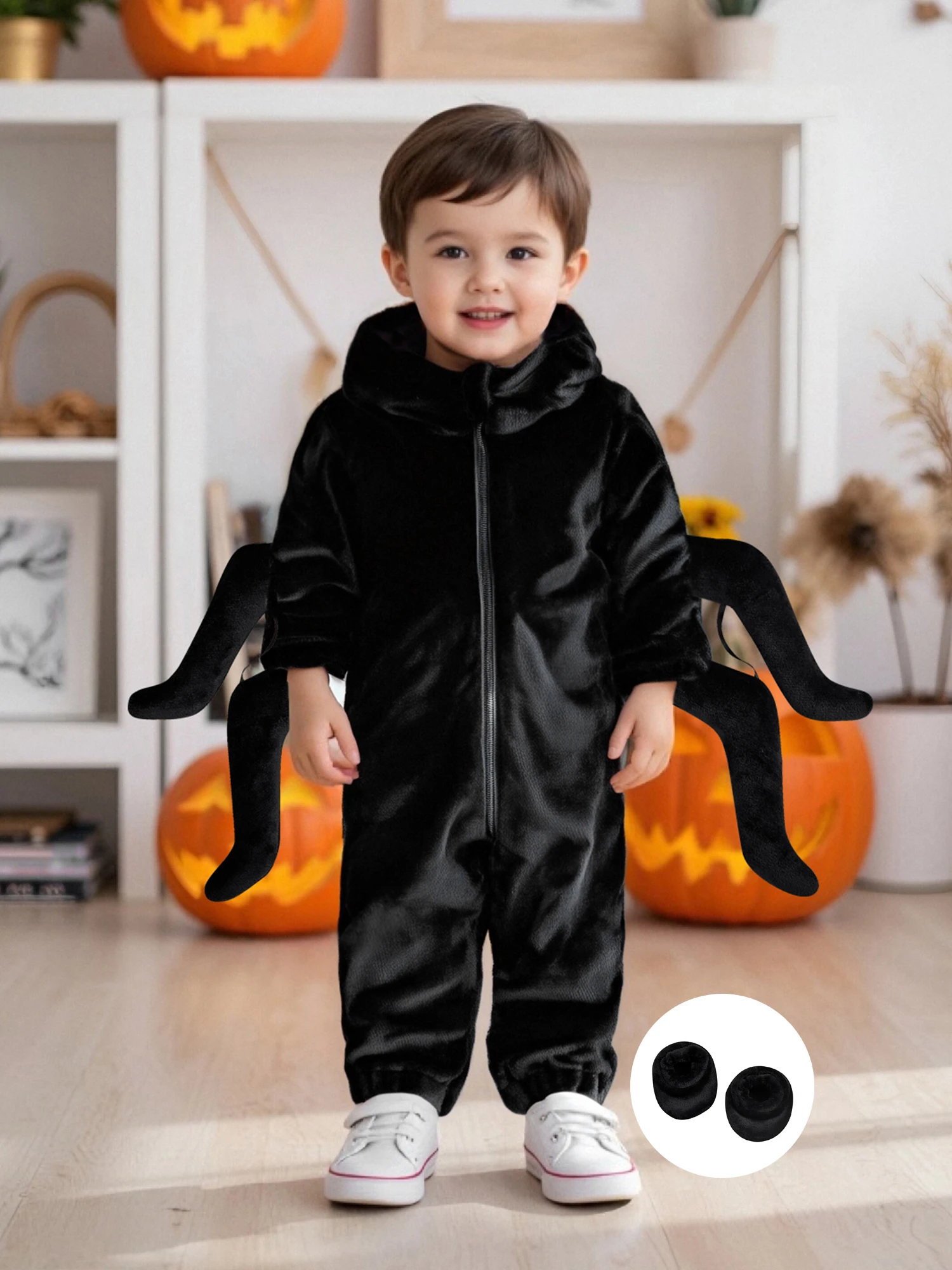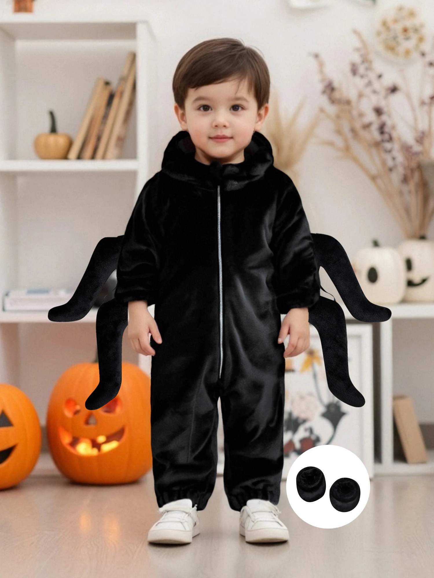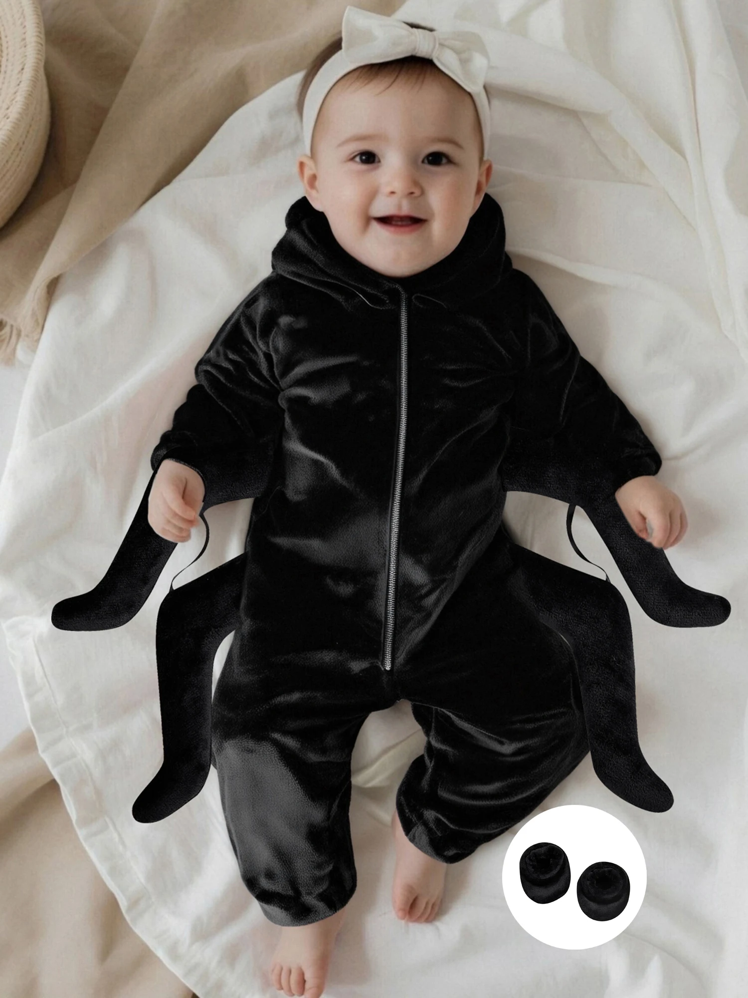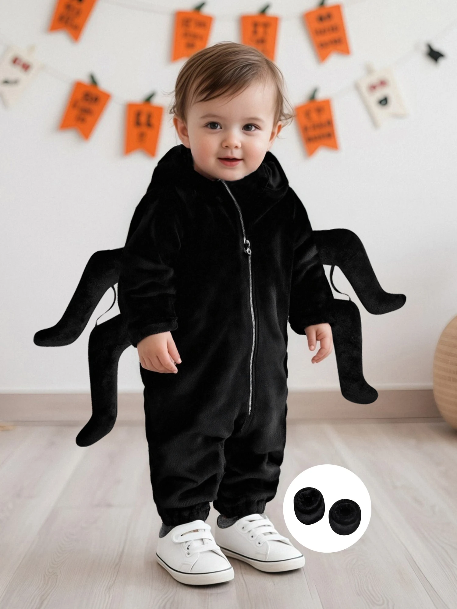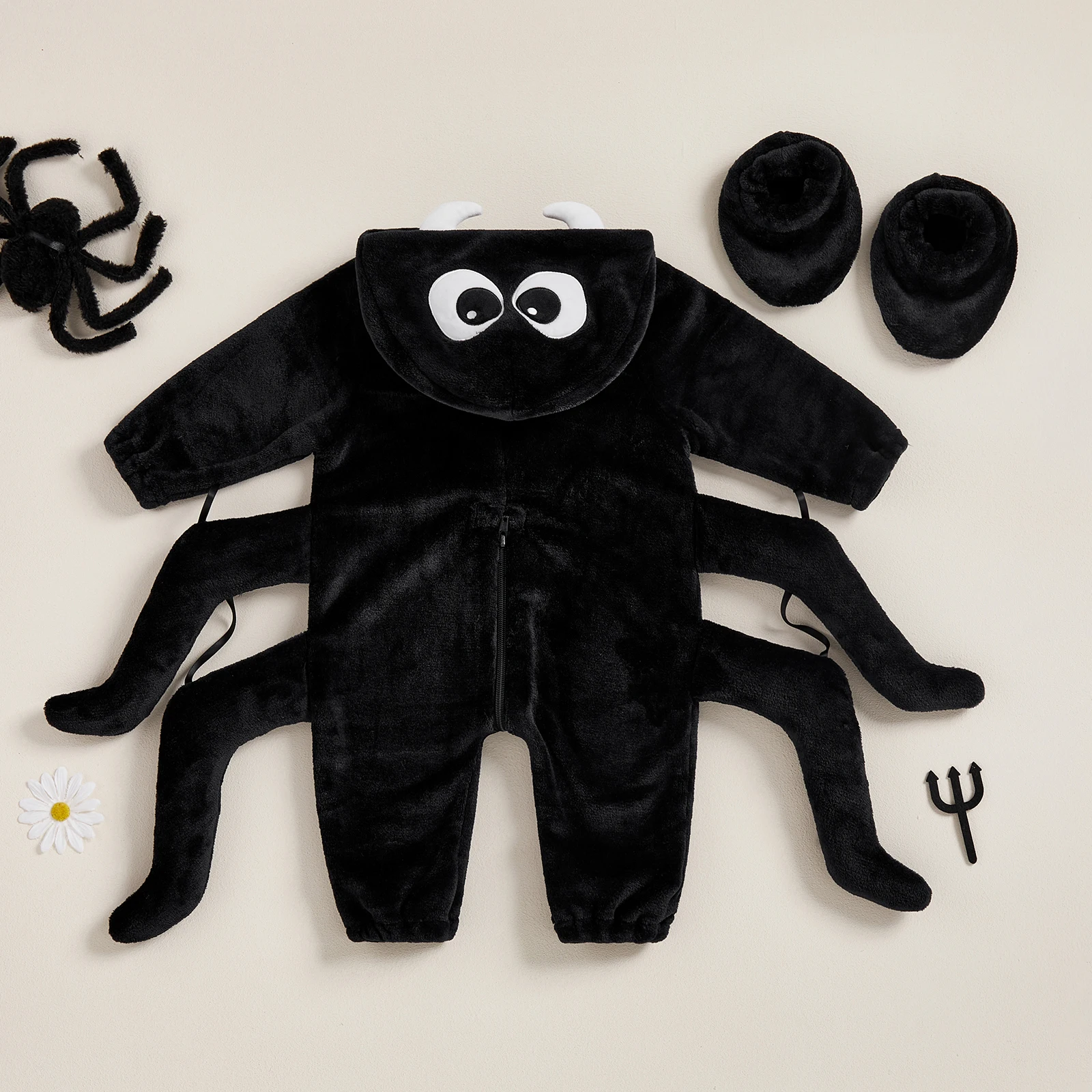 Get your little one ready for spooky fun with this adorable baby spider costume! Designed with eight playful legs, big cartoon eyes, and cozy foot covers, this jumpsuit is both cute and comfortable. The zipper-up design makes dressing quick and easy, while the hood adds an extra touch of Halloween charm. Perfect for parties, trick-or-treating, or just snapping cute festive photos.